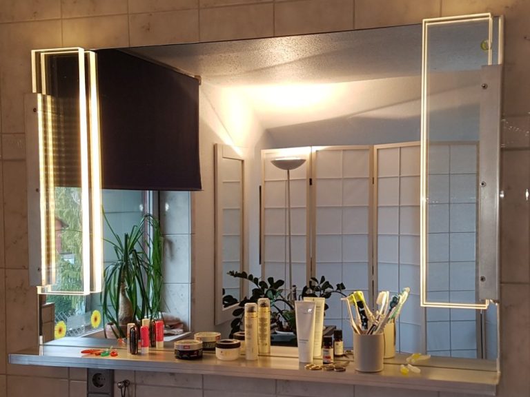 Beim Spiegel habe ich Design-elemente der Wandleuchte verwendet und weiterentwickelt. Die Leuchtelemente wurden rechts und links plaziert, der Trafo sitzt hinter dem Spiegel.