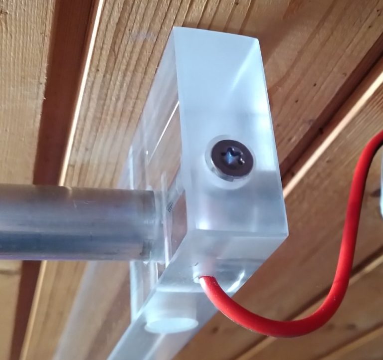 Recycling: Der Aluminiumkörper war Restmaterial der 'Decken-leuchte mit Erlenholz'. Darauf ein Winkelprofil mit LED-Streifen auf den Flächen. Die Stromversorgung der LEDs erfolgt über die tragenden Rohrprofile und die isolierten Kupferrohrabschnitte.